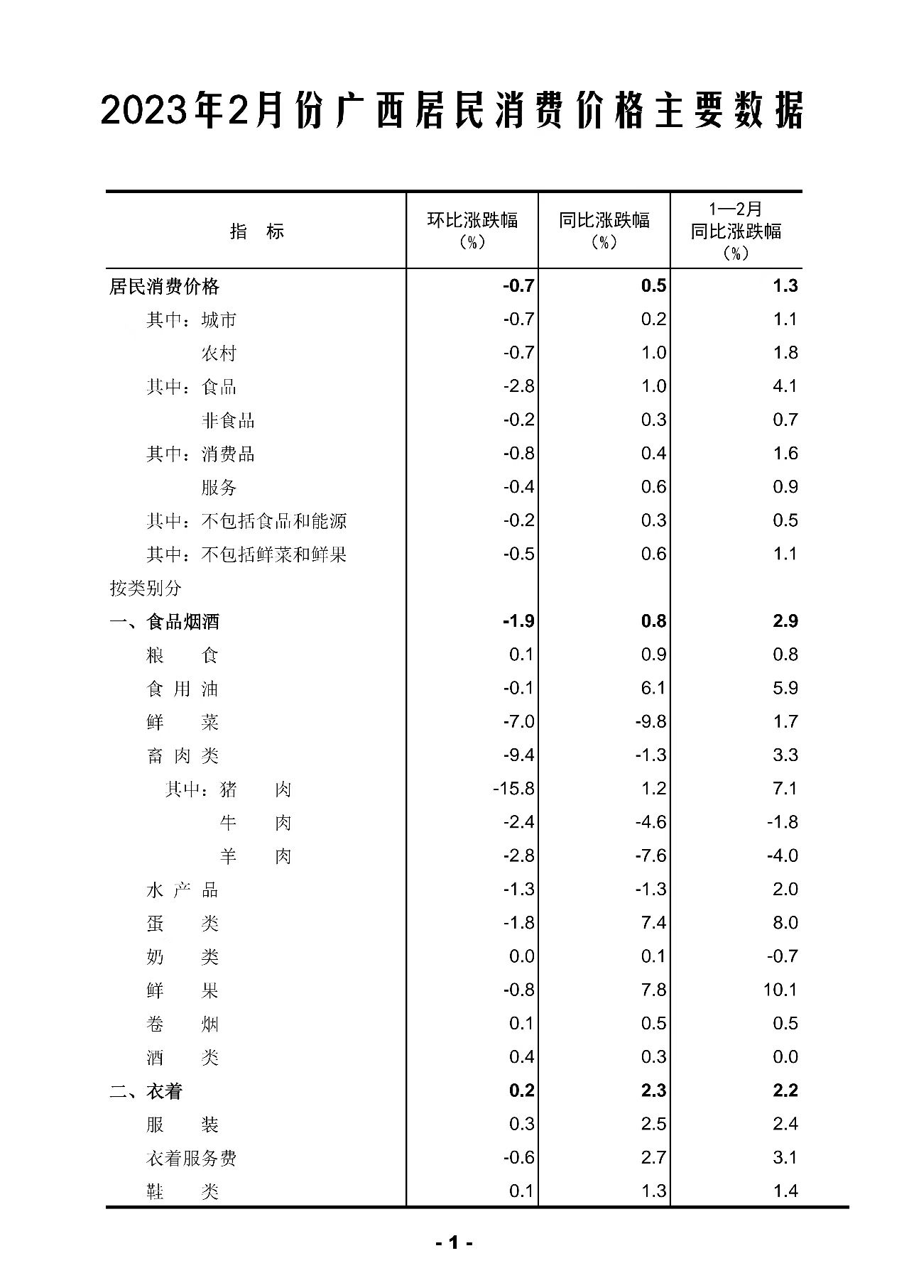 | 主 题 词 | 2023年2月份广西居民消费价格同比上涨0.5% 环比下降0.7% | ||