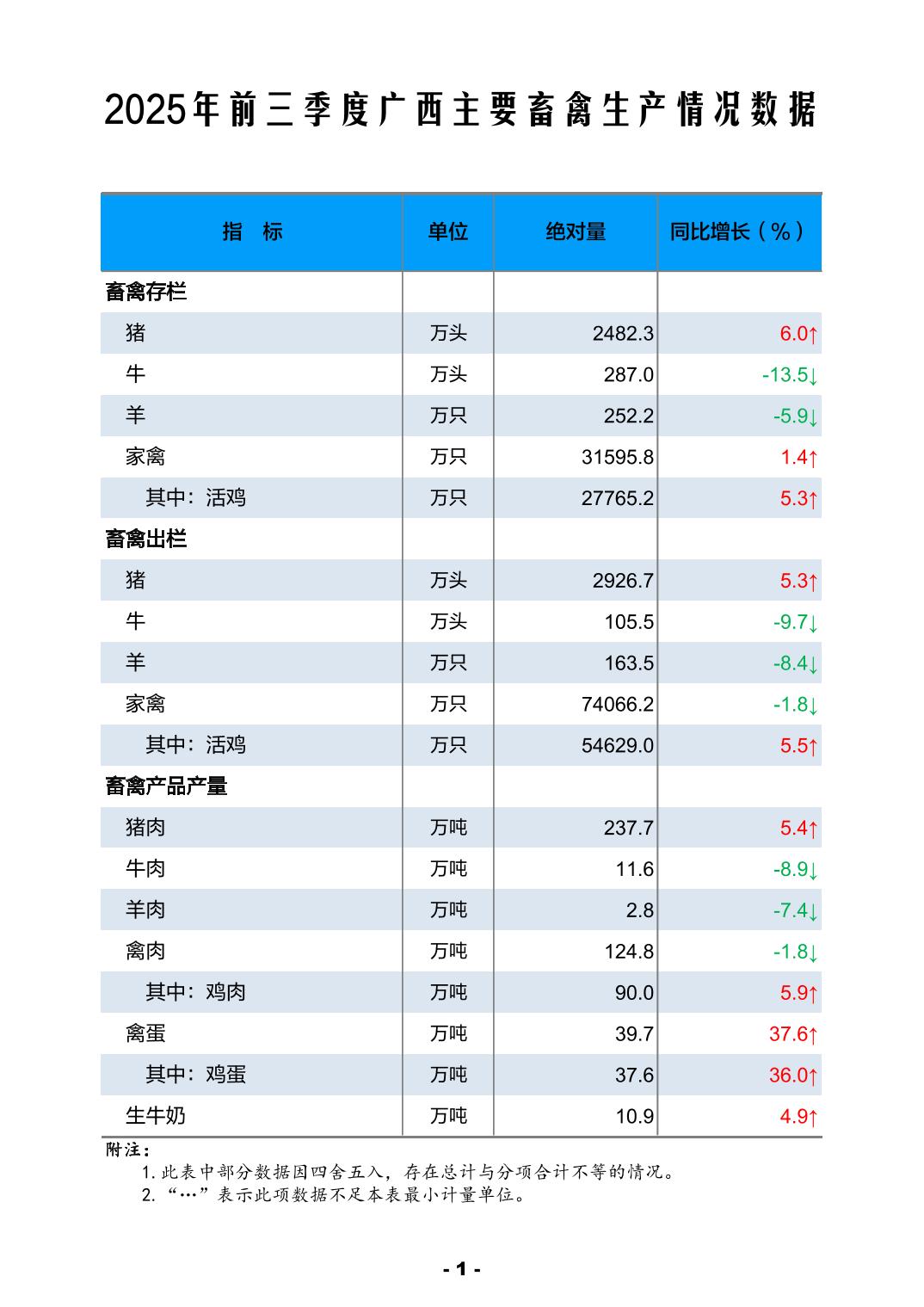 2025年前三季度广西主要畜禽生产情况数据