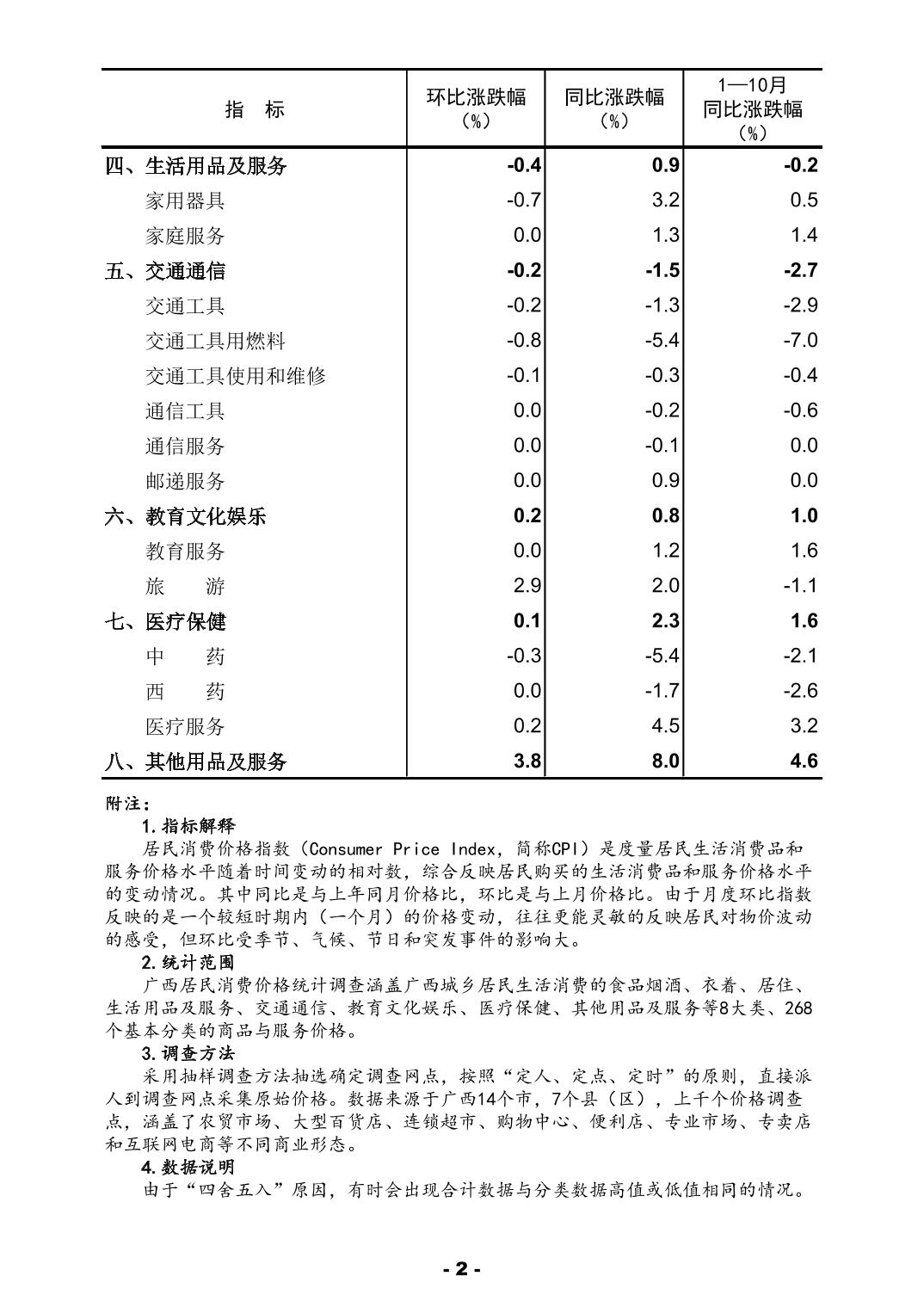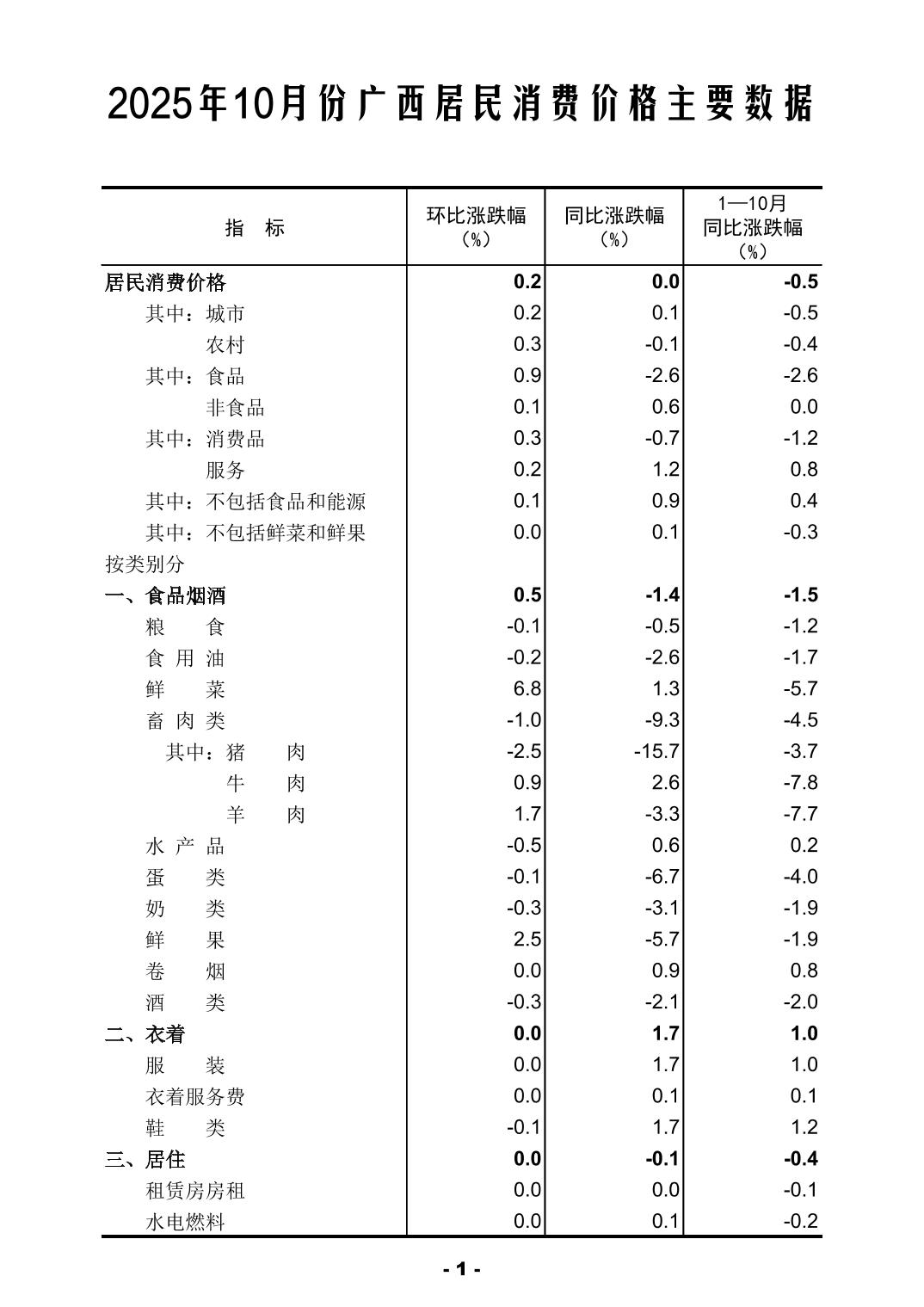 2025年10月份广西居民消费价格主要数据