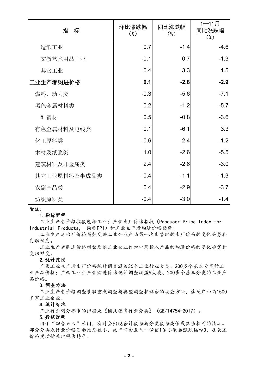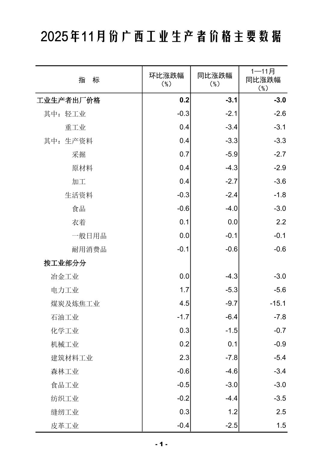 2025年11月份广西工业生产者价格主要数据