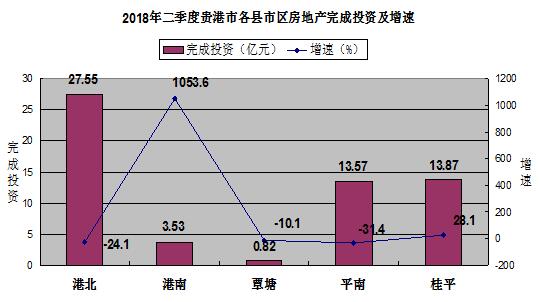 (一)完成投资依然回落较大,县区间的发展差异明显。二季度,全市房地产开发投资完成59.34亿元,同比下降12.9%。按用途分,商品住宅完成投资51.83亿元,同比下降2.3%;办公楼完成投资0.55亿元,同比增长1838.1%;商业营业用房完成投资4.17亿元,同比下降52.6%;其他投资完成2.78亿元,同比下降55.4%。按县市区分,港北房地产开发投资完成27.55亿元,同比下降24.1%;港南房地产开发投资完成3.53亿元,同比增长1053.6%;覃塘房地产开发投资完成0.82亿元,同比下降10.1%;平南房地产开发投资完成13.57亿元,同比下降31.4%,桂平房地产开发投资完成13.87亿元,同比增长28.1%。各县区二季度房地产完成投资及增速如下图