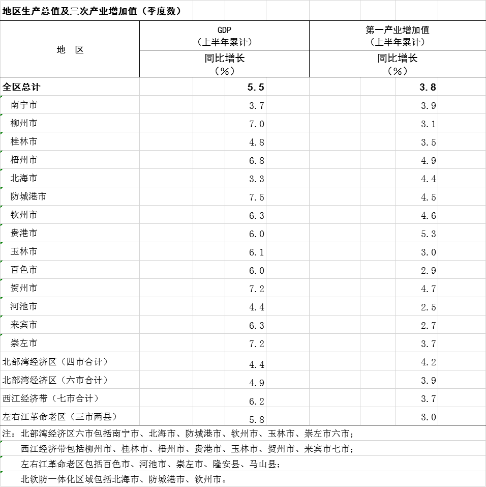 2025年上半年广西分市分区域地区生产总值及三次产业增加值(季度数)