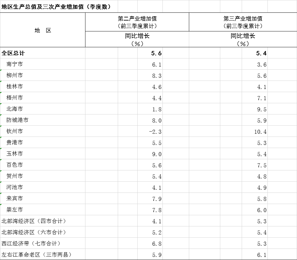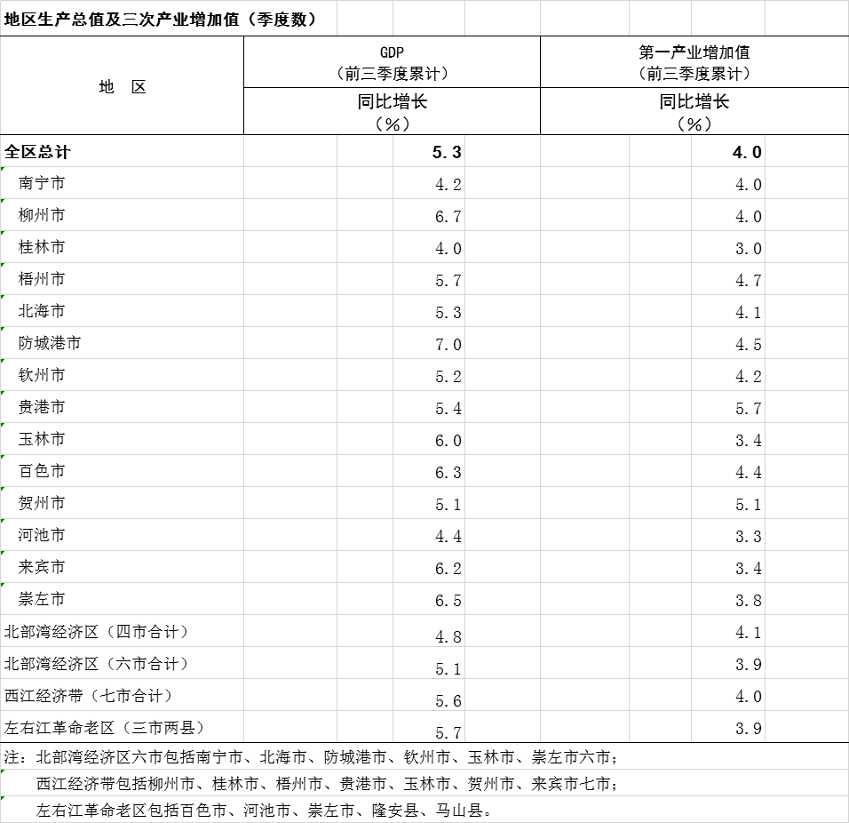 2025年前三季度广西分市分区域地区生产总值及三次产业增加值(季度数)