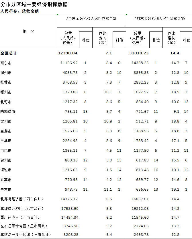 2020年1-2月广西分市分区域人民币存、贷款余额