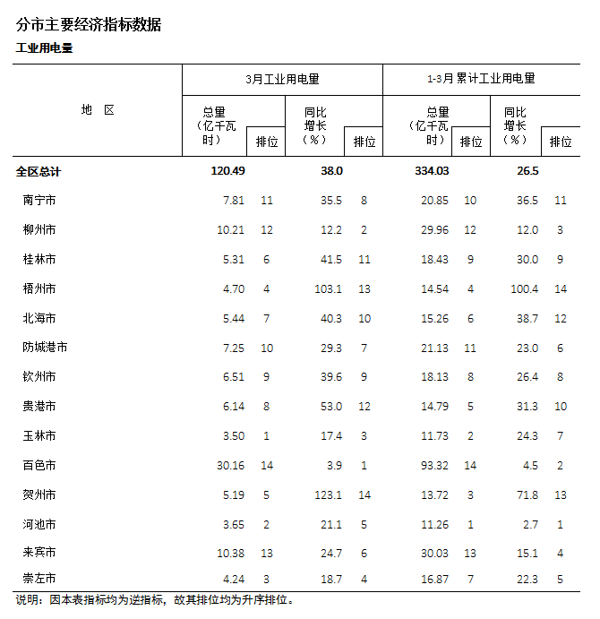 2021年1-3月广西分市分区域规模以上工业企业能源消费及全社会用电量