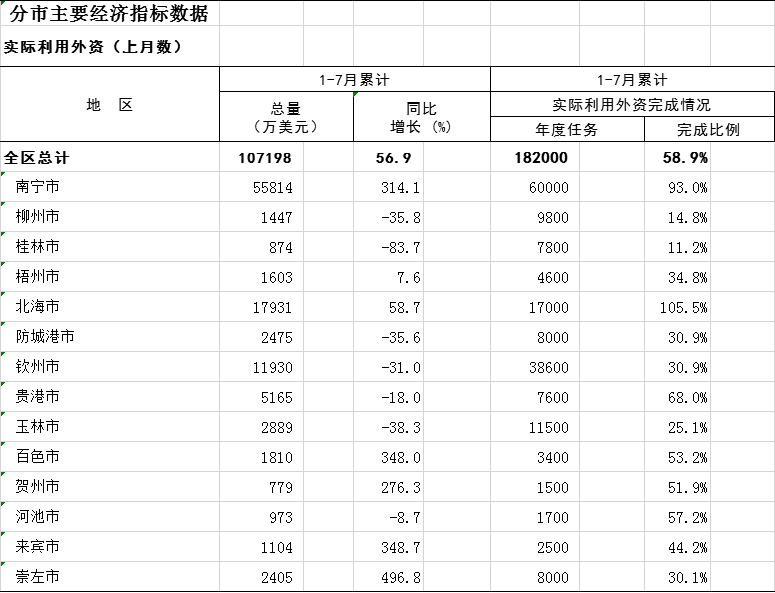 2022年1-8月广西分市实际利用外资(上月数)