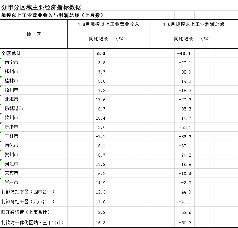 2022年1-9月广西分市分区域规模以上工业企业营业收入与利润总额(上月数)