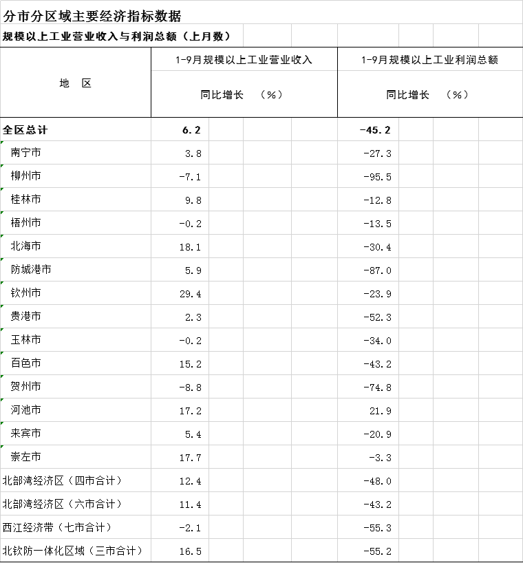 2022年1-10月广西分市分区域规模以上工业营业收入与利润总额(上月数)