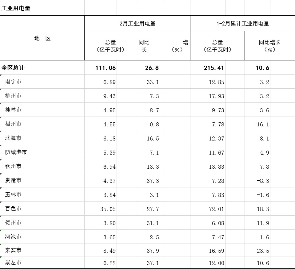 2023年1-2月广西分市工业用电量