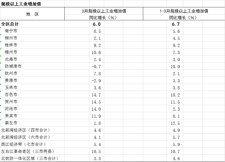 2023年1-3月广西分市分区域规模以上工业增加值