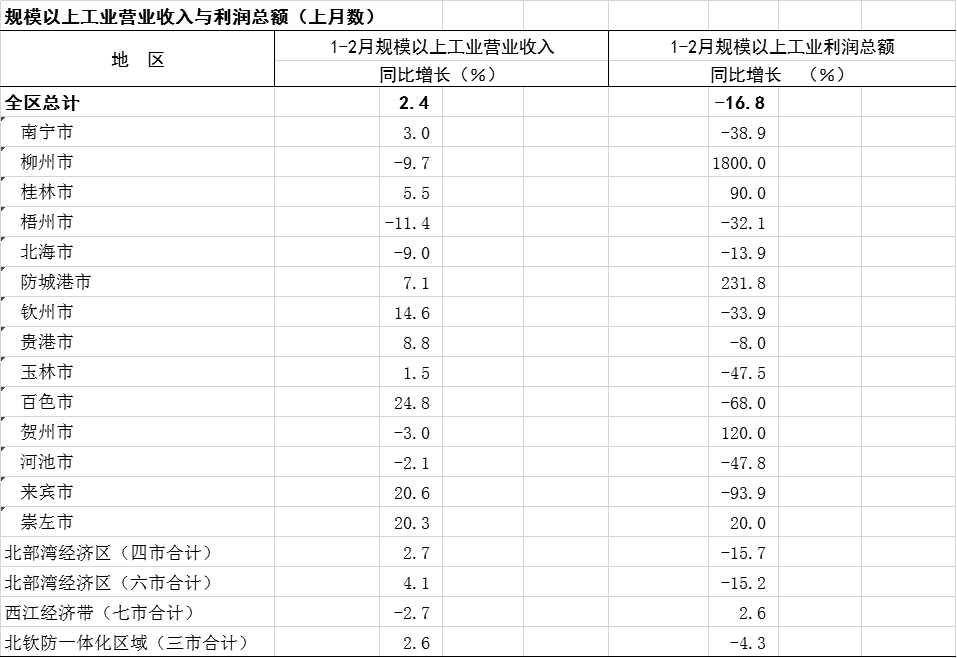 2023年1-3月广西分市分区域规模以上工业营业收入与利润总额(上月数)