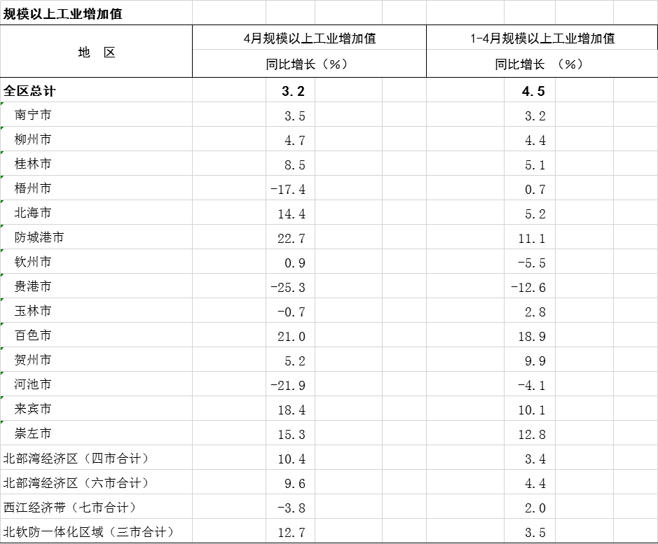 2023年1-4月广西分市分区域规模以上工业增加值