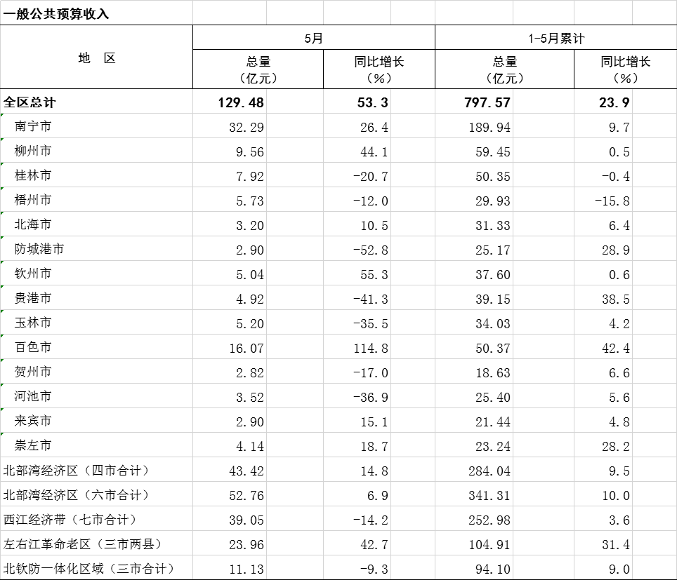 2023年1-5月广西分市分区域一般公共预算收入