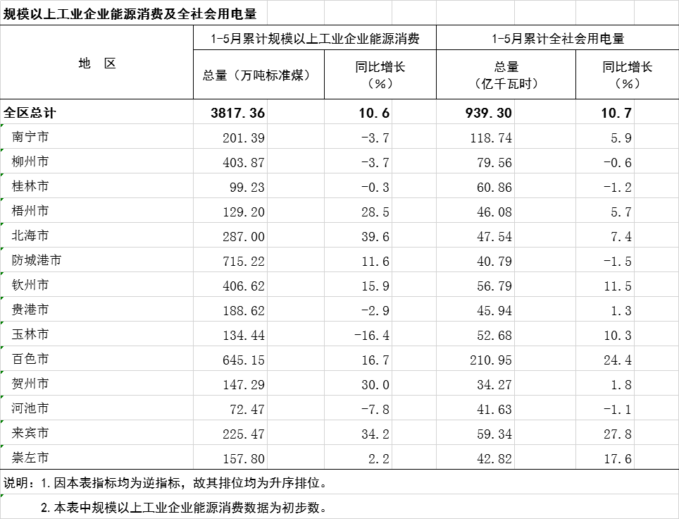 2023年1-5月广西分市规模以上工业企业能源消费及全社会用电量