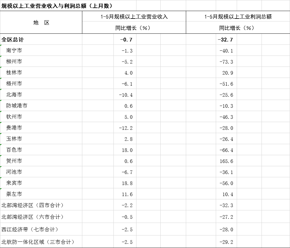 2023年1-6月广西分市分区域规模以上工业营业收入与利润总额(上月数)