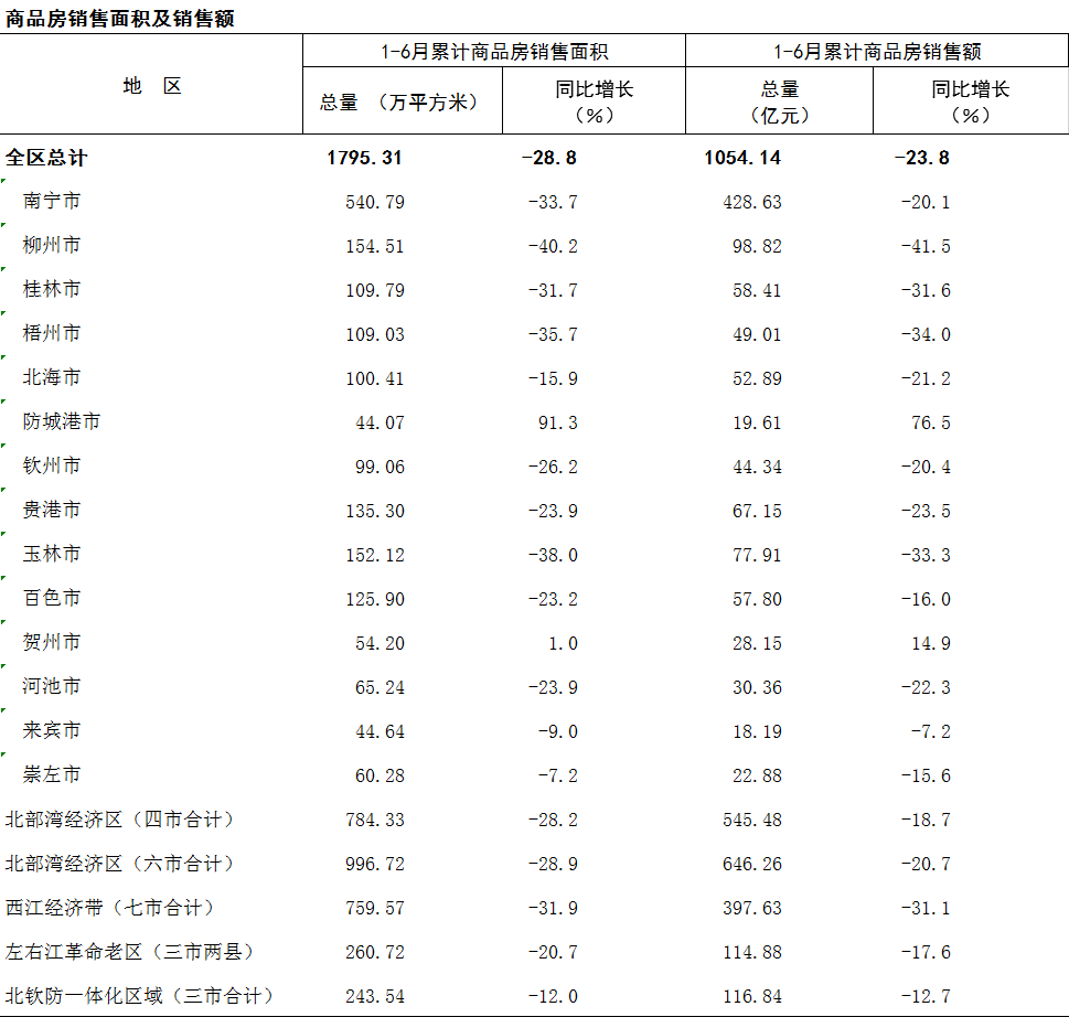 2023年1-6月广西分市分区域商品房销售面积及销售额