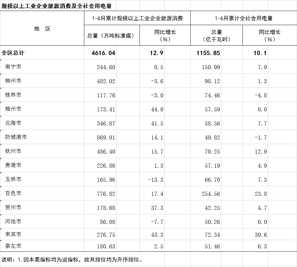 2023年1-6月广西分市规模以上工业企业能源消费及全社会用电量