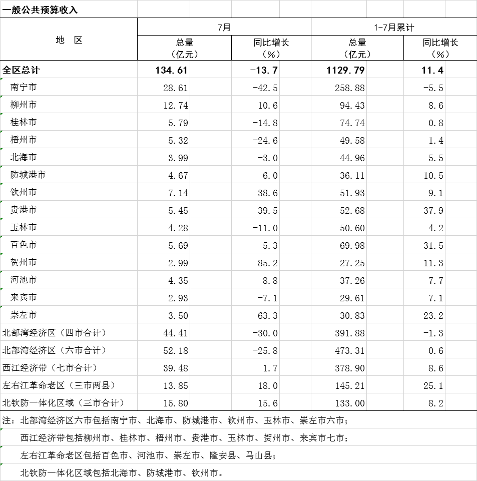 2023年1-7月广西分市分区域一般公共预算收入