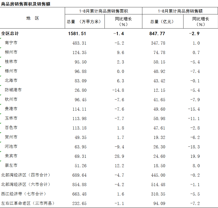 2025年1-8月广西分市分区域商品房销售面积及销售额