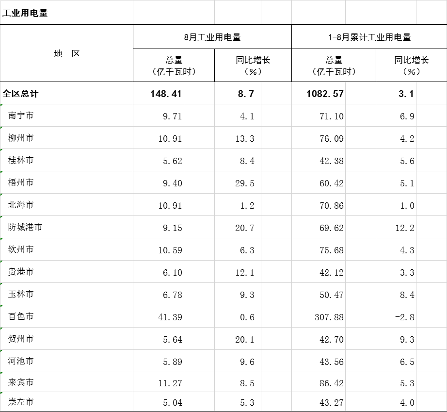 2025年1-8月广西分市规模以上工业企业能源消费及全社会用电量