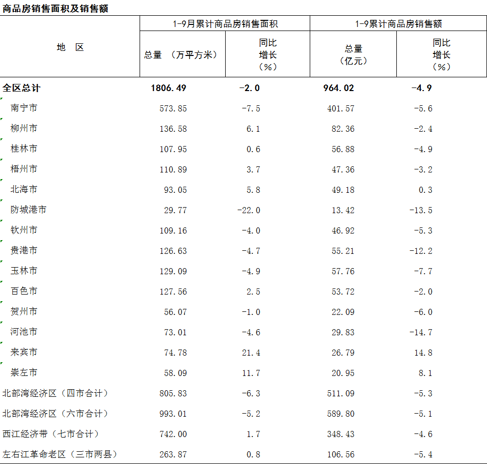 2025年1-9月广西分市分区域商品房销售面积及销售额