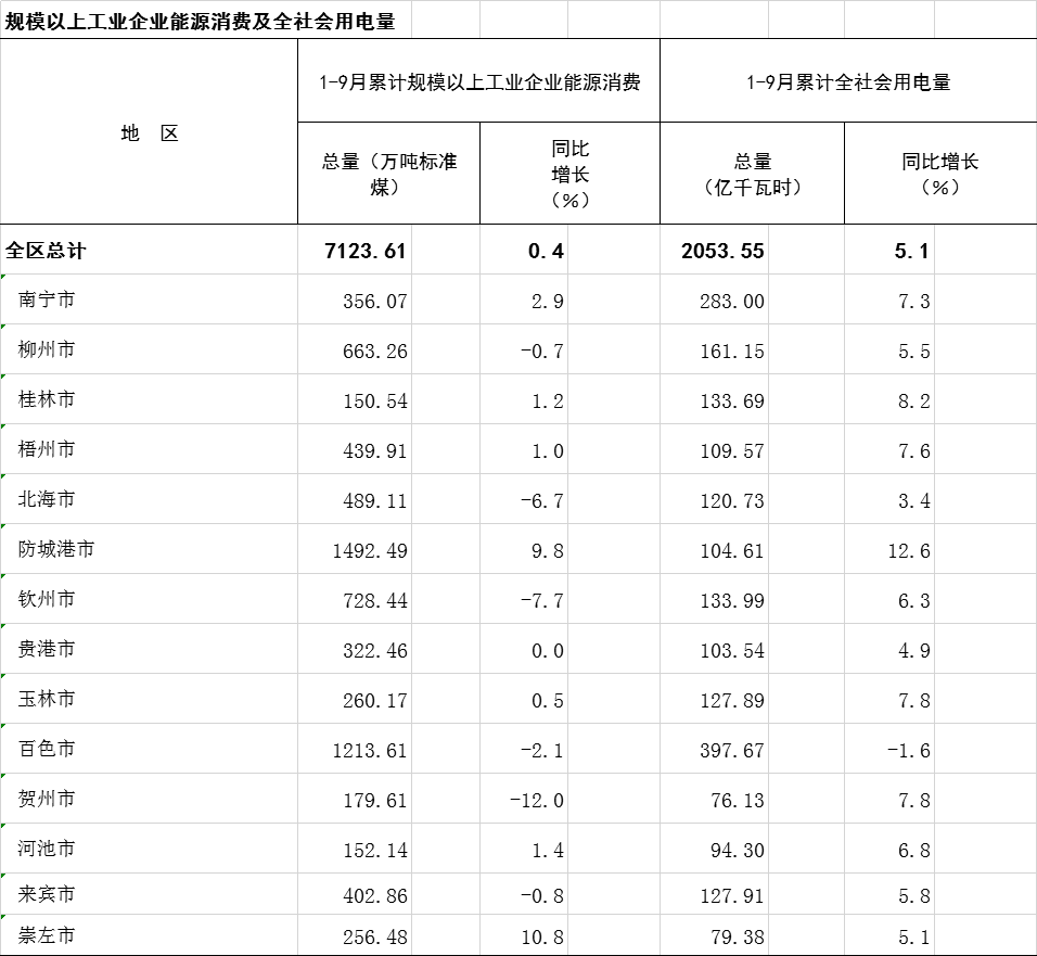 2025年1-9月广西分市规模以上工业企业能源消费及全社会用电量
