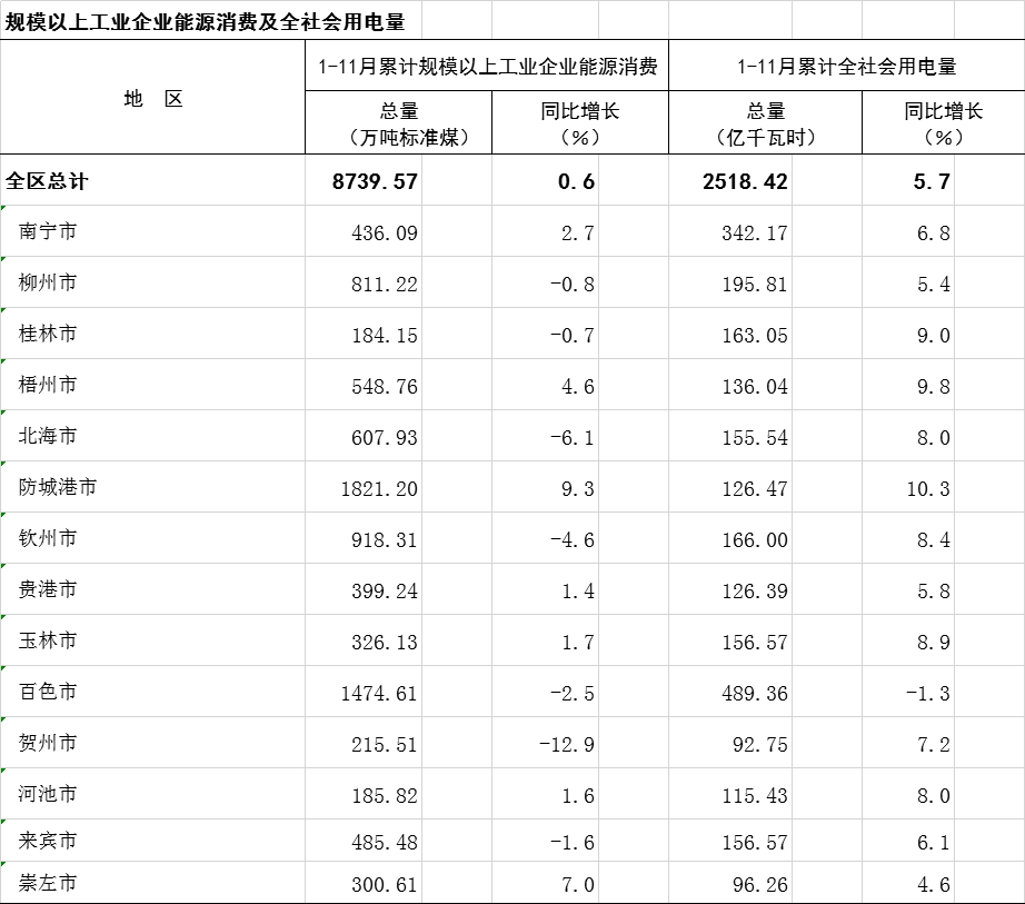 2025年1-11月广西分市规模以上工业企业能源消费及全社会用电量