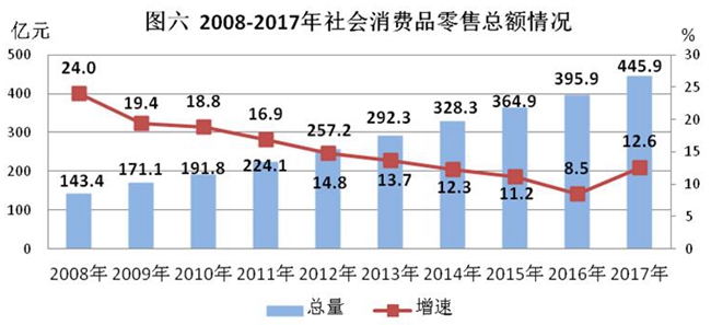 全年社会消费品零售总额445.9亿元,比上年增长12.6%(如图六)。其中,批发业实现销售额169.8亿元,增长12.9%