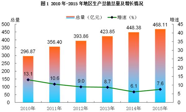 初步核算(下同),全年实现地区生产总值468.11亿元,按可比价格计算,比上年增长7.6%。分产业看,第一产业增加值103.14亿元,增长4.6%;第二产业增加值188.68亿元,增长6.6%;第三产业增加值176.28亿元,增长11.2%。第一、二、三产业增加值占地区生产总值的比重分别为22.03%、40.31%和37.66%,对经济增长的贡献率分别为11%、43.5%和45.5%。按常住人口计算,人均地区生产总值23178元。
