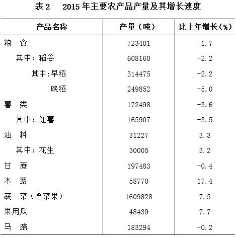 全年农作物总播种面积24.77万公顷,下降0.3%。其中,粮食播种面积13.52万公顷,下降2.1%;经济作物播种面积3.71万公顷,下降1.2%;其他作物播种面积7.55万公顷,增长3.6%。全年粮食总产量72.34万吨,下降1.7%。水果总产量68.74万吨,增长12.2%;蔬菜产量160.98万吨,增长7.5%。