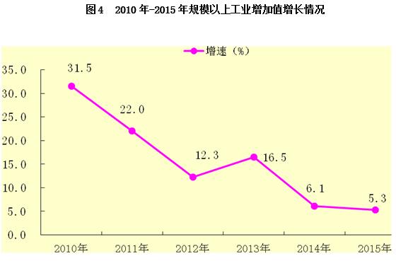 全年全部工业增加值126.87亿元,比上年增长5.4%。规模以上工业增加值增长5.3%。在规模以上工业中,轻工业增长3.6%,重工业增长5.8%。国有企业下降5.1%,股份制企业增长10.4%,外商及港澳台商投资企业下降9.7%,其他经济类型企业下降0.2%。