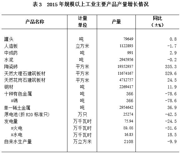 全年规模以上工业中,非金属矿采选业增长0.6%;农副产品加工业下降0.6%;食品制造业增长7.0%;木材加工及木、竹、藤、棕、草制品业下降5.1%;印刷业和记录媒介的复制增长9.6%;化学原料及化学制品制造业增长14.5%;非金属矿物制品业增长15.0%;黑色金属冶炼及压延加工业增长16.7%;有色金属冶炼及压延加工业增长10.8%;电气机械及器材制造业下降2.7%;电力、热力生产和供应业下降11.0%。