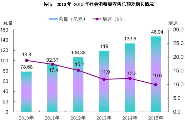 全年社会消费品零售总额146.94亿元,比上年增长10.0%,其中,限额以上企业(单位)消费品零售额25.32亿元,增长12.6%。按经营单位所在地分,城镇消费品零售额112.79亿元,比上年增长9.8%;乡村消费品零售额34.15亿元,增长10.5%。按消费形态分,餐饮收入6.45亿元,比上年增长22.1%;商品零售140.49亿元,增长9.5%。在商品零售中,限额以上企业(单位)商品零售额24.05亿元,增长12.4%。其中,粮油、食品类增长8.1%;烟酒类增长36.0%;家用电器和音像器材类增长6.7%;汽车类增长34.7%;日用品类增长36.5%;石油及制品类增长6.5%。