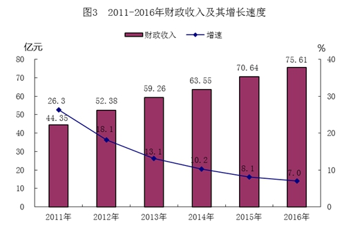 全年财政收入75.61亿元,增长7.0%。其中,税收收入54.65亿元,增长8.1%;非税收收入20.96亿元,增长4.5%。公共财政预算收入55.65亿元,增长6.9%。公共财政预算支出127.60亿元,下降3.1%。其中,农林水事务支出增长10.5%,医疗卫生与计划生育支出增长18.8%,教育支出增长8.9%,社会保障和就业支出增长9.2%,城乡社区事务支出增长38.2%,住房保障支出下降32.7%,节能环保支出下降46.3%,文化体育与传媒支出下降19.4%,科学技术支出下降2.7%。