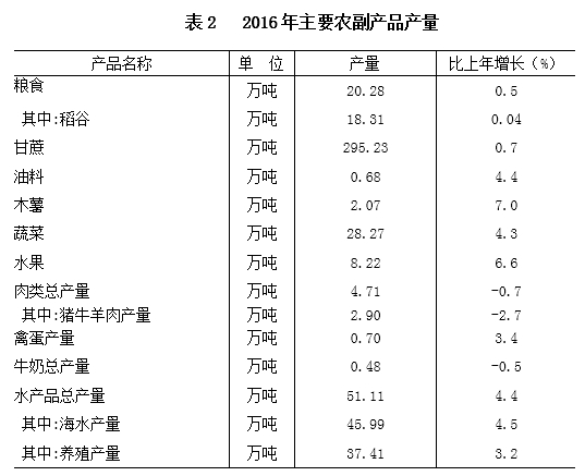 全年农作物总播种面积125.35千公顷,比上年增加2.21千公顷。其中,粮食种植面积50.01千公顷,减少0.08千公顷;油料种植面积3.37千公顷,增加0.13千公顷;甘蔗种植面积44.47千公顷,增加0.16千公顷;蔬菜种植面积23.19千公顷,增加0.90千公顷。年末果园面积11.33千公顷,增加0.2千公顷。全年粮食总产量20.28万吨,增长0.5%;甘蔗产量295.23万吨,增加2.06万吨,增长0.7%;油料产量0.68万吨,增长4.4%;水果产量8.22万吨,增长6.6%;蔬菜产量29.50万吨,增长4.3%。