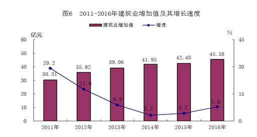 全年建筑业增加值45.38亿元,增长7.2%。具有资质等级的总承包和专业承包建筑业企业72家,全年完成建筑业总产值111.10亿元,增长32.0%;房屋建筑施工面积465.44万平方米,增长18.1%;房屋建筑竣工面积331.90万平方米,增长15.1%。