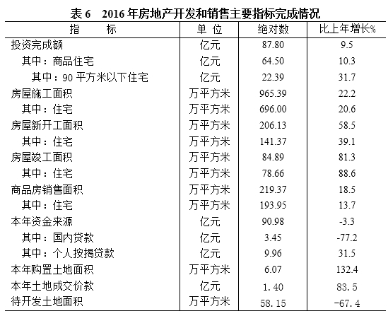 在房地产开发投资中,商品住宅投资64.50亿元,增长10.3%;办公楼投资6.42亿元,增长63.7%;商业营业用房投资13.30亿元,增长1.9%;其他用房投资3.57亿元,下降24.7%。