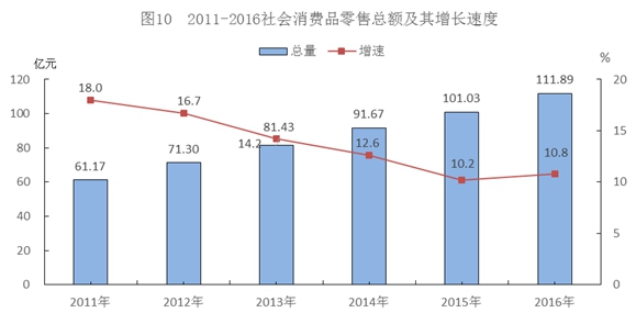 全年实现社会消费品零售总额111.89亿元,增长10.8%,扣除价格因素,实际增长8.9%。按经营地统计,城镇消费品零售额100.62亿元,增长10.8%;乡村消费品零售额11.27亿元,增长10.6%。