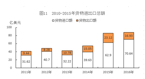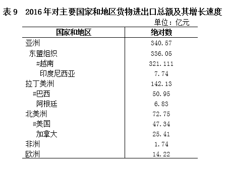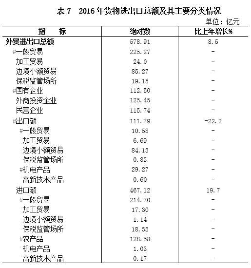 据海关统计,全年货物进出口总额578.91亿元,增长8.5%,其中,进口总额467.12亿元,增长19.7%;出口总额111.79亿元,下降22.2%。外贸进出口规模居全区第2位,其中进口占全区进口总量的28.4%,居全区第2位。全年边境小额贸易(边民互市贸易除外)12.92亿美元,下降33.7%,其中,进口0.17亿美元,下降76.1%;出口12.74亿美元,下降32.0%。
