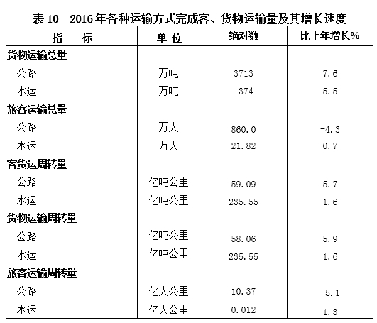 全年交通运输、仓储及邮政业实现增加值52.87亿元,增长3.1%。全年公路和水路客货运周转量294.65亿吨公里,增长2.4%。其中,货物运输总量5087万吨,增长7.0%;旅客运输总量881.82万人,下降4.2%。