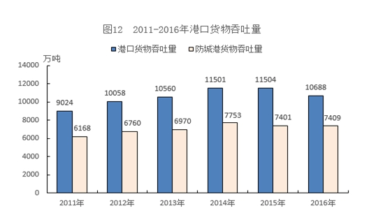 全年港口货物吞吐10688万吨,下降7.1%,其中集装箱吞吐量完成26.63万标准箱,下降27.8%。从全年各季度来看,一季度完成2571万吨,下降6.0%;二季度完成2768万吨,增长4.7%;三季度完成2506万吨,下降16.1%;四季度完成2843万吨,下降增长9.4%。从货物贸易方式看,外贸货物吞吐量7948万吨,下降8.3%;内贸货物吞吐量2741万吨,下降3.2%。从吞吐方式看,进口8055万吨,下降2.6%;出口2634万吨,下降18.5%。从港口规模来看,防城港完成货物吞吐量7409万吨,增长0.1%,总量占全市吞吐量69.3%;中小港完成吞吐量3131万吨,占全市吞吐量29.3%(云约江码头单列)。从商品主要种类看,完成吞吐量前五位货种分别为金属矿石3601万吨、煤炭及制品2824万吨、矿建材料641万吨、化工原料及制品601万吨、钢铁552万吨。