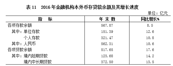 年末,金融机构本外币各项存款余额567.87亿元,同比增长8.5%,其中人民币各项存款余额562.31亿元,同比增长10.6%;金融机构本外币各项贷款余额517.65亿元,同比增长17.6%,其中人民币各项贷款余额511.47亿元,同比增长20.3%。全年新增金融机构本外币贷款77.36亿元,同比增长136.8%。