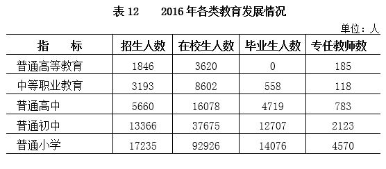 全年普通高等教育招生1846人,在校生3620人。各类中等职业教育招生3193人,在校生8602人,毕业生558人。普通高中招生5660人,在校生16078人,毕业生4719人。普通初中招生13366人,在校生37675人,毕业生12707人。普通小学招生17235人,在校生92926人,毕业生14076人。幼儿园在园儿童41335人。