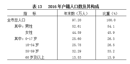 年末常住人口92.90万人,比上年末增加1.06万人,其中城镇人口52.36万人。全年人口出生率14.66‰,人口死亡率4.72‰,人口自然增长率9.94‰。据公安部门统计,年末全市户籍人口97.20万人,比上年末增加1.59万人。
