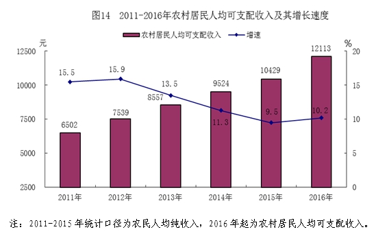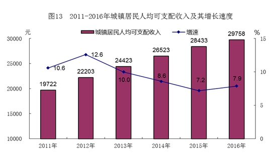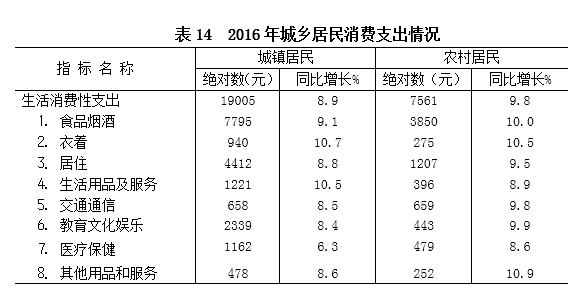 全年城镇居民人均可支配收入29758元,增长7.9%,扣除价格因素,实际增长6.7%;农村居民可支配收入12113元,增长10.2%,扣除价格因素,实际增长8.4%。城镇居民人均生活消费支出19005元,增长8.9%,扣除价格因素,实际增长7.7%;农村居民人均生活消费支出7561元,增长9.8%,扣除价格因素,实际增长8.0%。城镇居民食品烟酒消费支出占消费总支出的比重为41.0%,农村居民家庭食品烟酒消费支出占消费总支出的比重为50.9%。