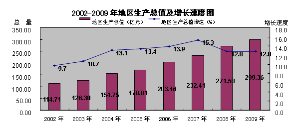 国民经济平稳较快发展。初步核算,全市生产总值299.36亿元,比上年增长12.8%,增速与上年持平。人均地区生产总值13016元(按常住人口计算),增长11.9%。分产业看,第一产业增加值80.37亿元,增长4.7%;第二产业增加值129.44亿元,增长16.2%,其中,工业增加值109.47亿元,增长12.0%;第三产业增加值89.55亿元,增长14.7%。自2003年以来,连续七年增长两位数以上。见下图:
