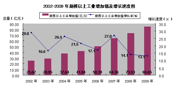 工业生产低速增长。全年全部工业增加值109.47亿元,比上年增长12.0%。规模以上工业增加值84.65亿元,增长13.1%,维持低速增长,是近七年来增速最低的一年。如图所示。