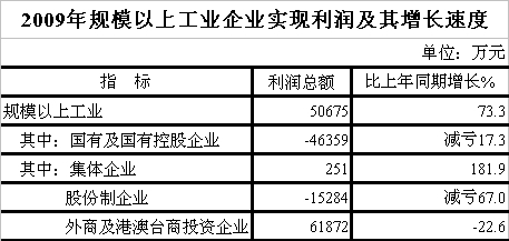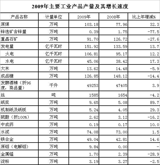 部分行业效益有所好转。2009年全市规模以上工业经济效益综合指数为196.9,下降1.9个点。主营业务收入214.47亿元,增长11.4%;利税总额16.53亿元,增长13.5%;盈亏相抵后实现利润50675万元,增长73.3%。在支柱产业中,电力生产业实现利润4.75亿元,增长1.3倍;铁合金冶炼业亏损2.89亿元,比上年增亏1.36亿元;铝冶炼业亏损2.17亿元;制糖业实现利润4.83亿元,增长1.9倍。