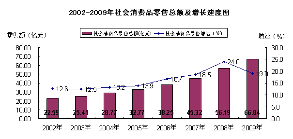 全年社会消费品零售总额66.84亿元,比上年增长19.0%。分地域看,城市消费品零售额21.01亿元,增长18.4%;县的消费品零售额17.46亿元,增长18.7%,县以下消费品零售额28.37亿元,增长19.5%。分行业看,批发和零售业零售额56.20亿元,增长19.5%;住宿和餐饮业零售额10.52亿元,增长15.9%;其他行业零售额0.13亿元,增长57.4%。