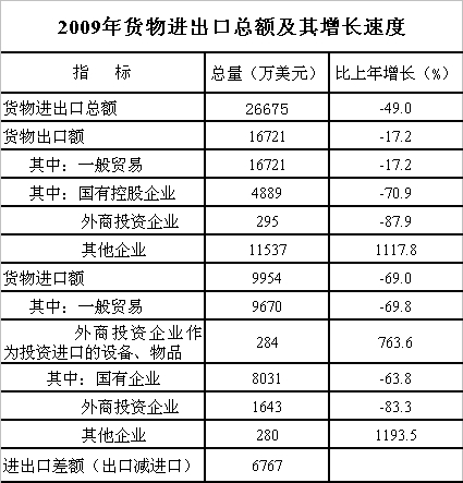 受国内外市场的影响,全年货物进出口总额2.67亿美元,比上年下降49.0%。其中,货物出口1.67亿美元,下降17.2%;货物进口1.00亿美元,下降69.0%。进出口差额(出口减进口)0.68亿美元,比上年增加1.86亿美元(上年逆差)。